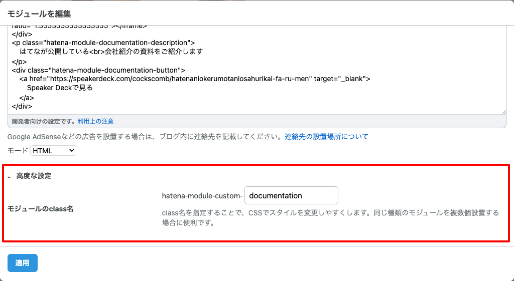 hatena-module-documentation-slideのクラス名が付いているdivタグ内に、埋め込み用HTMLを貼り付けてください。