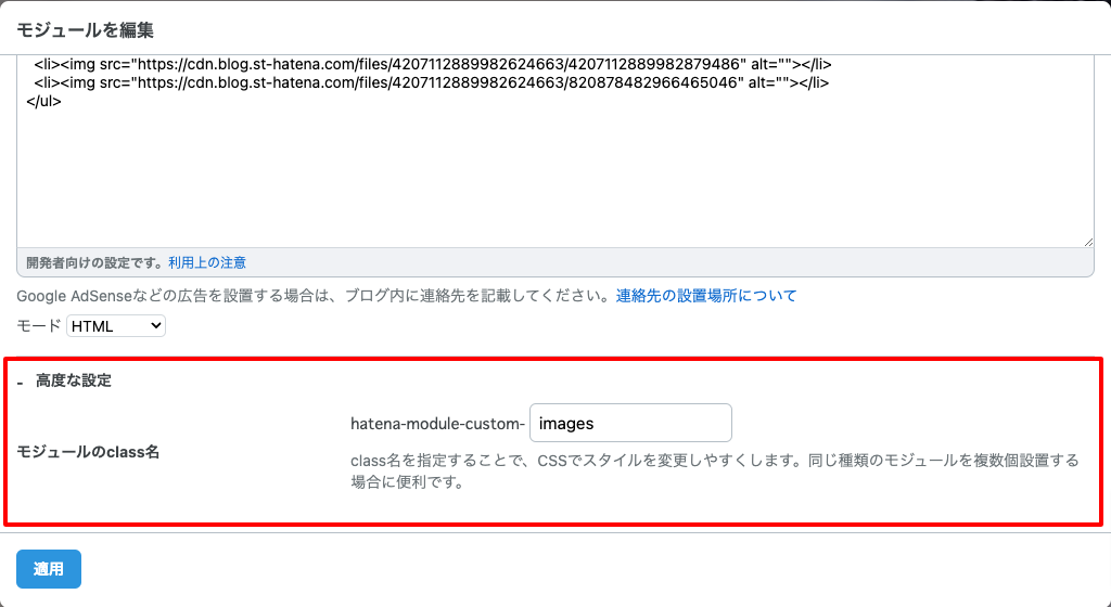 3. [高度な設定] を開き、class名に『images』と設定する